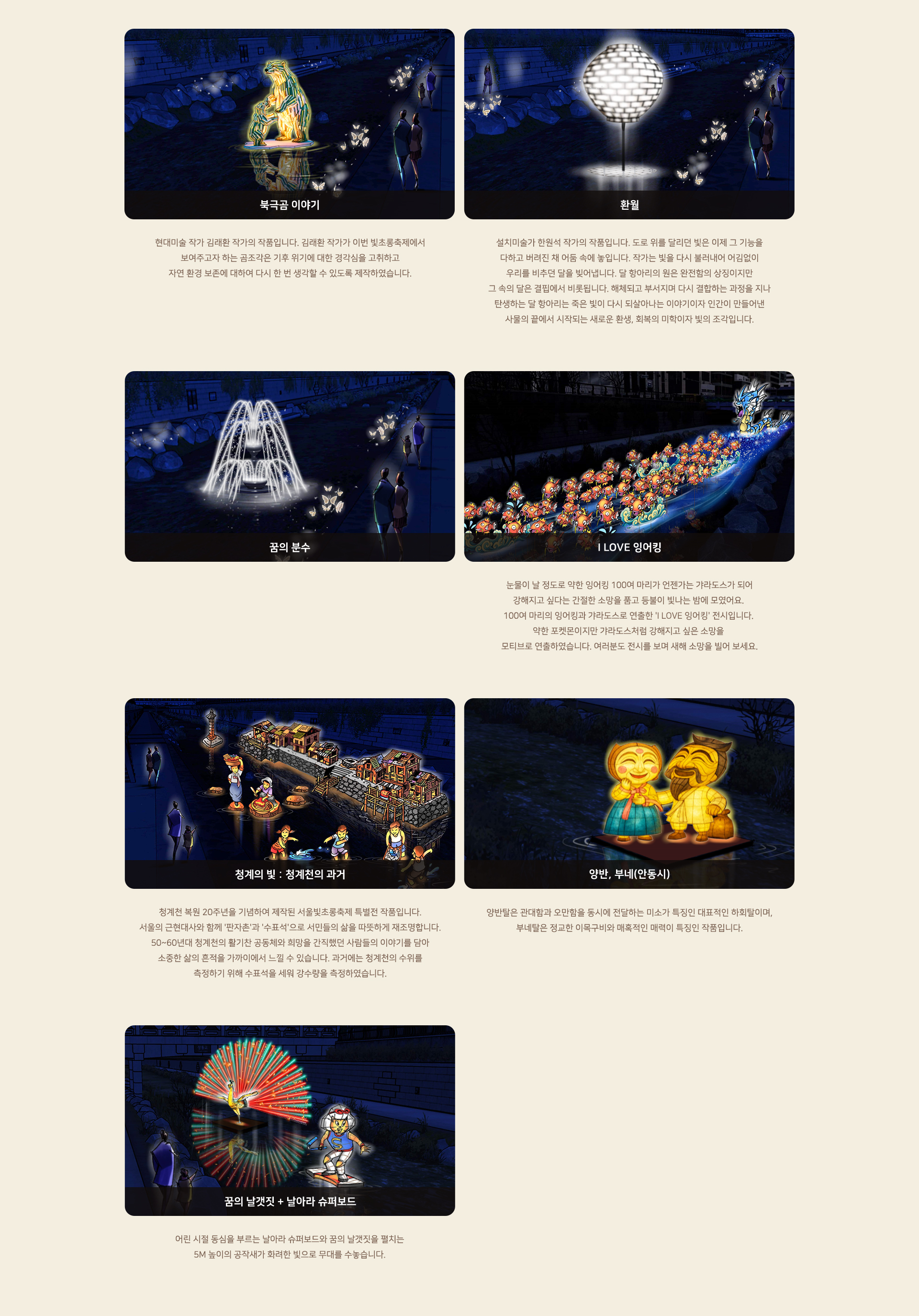 2009년 청계천 복원과 함께 시작된 이 축제는 이제 서울의 겨울 필수 코스입니다. 단순한 조명 쇼가 아니라, 서울의 역사와 미래를 빛으로 풀어내는 이야기 입니다. 올해 테마 "나의 빛, 우리의 꿈, 서울의 마법"은 청계천의 전통과 우이천의 자연을 연결하며, 방문자 각자의 '꿈'을 랜턴에 담아보는 참여형 콘셉트입니다.