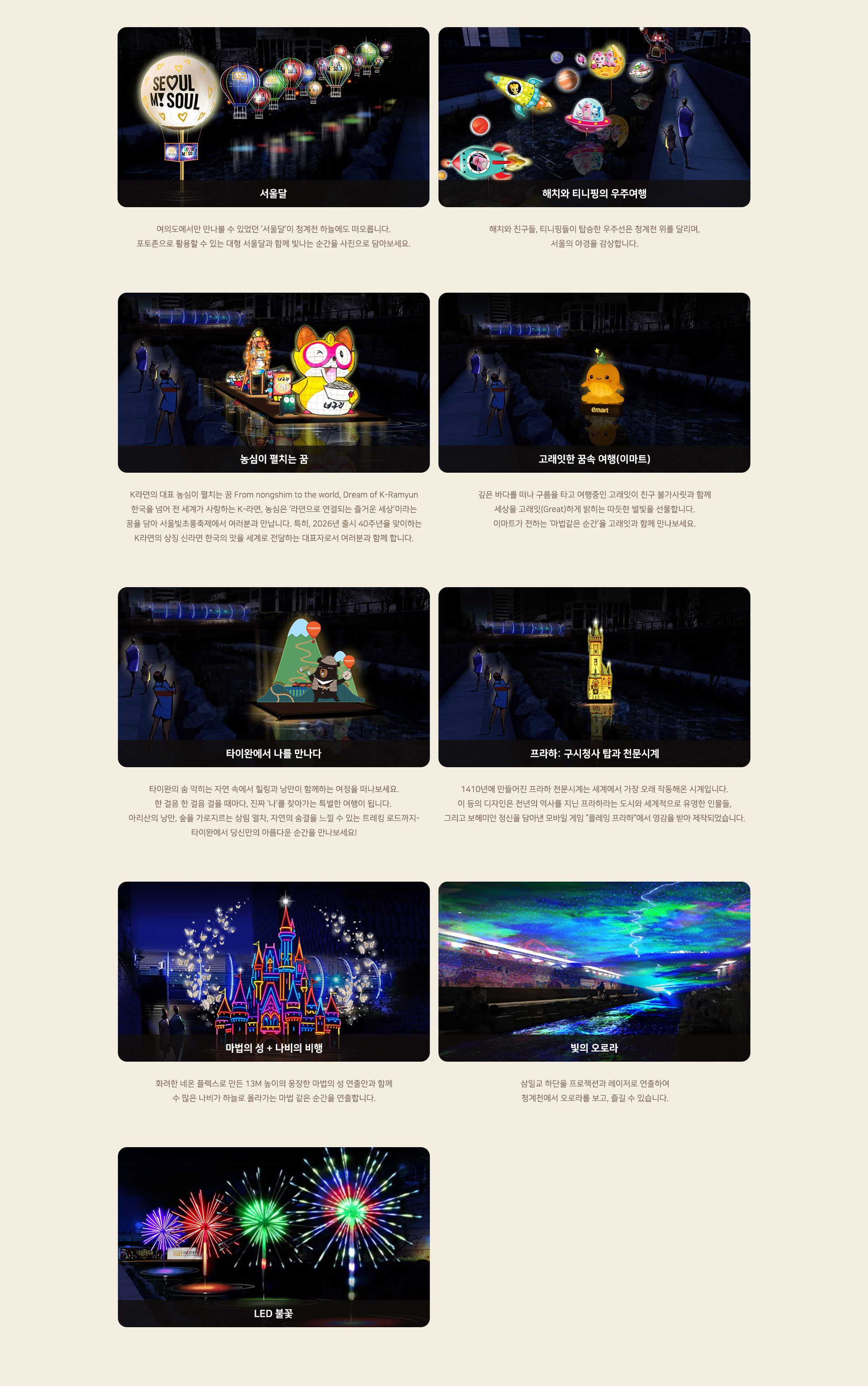 - 꿈의 강변 존 (중간): 방문자 랜턴 걸기 이벤트. 올해는 '2026 소망 랜턴'으로, 종이에 꿈 적어 매달아요. 작년처럼 10만 개 랜턴이 강을 채울 거예요.